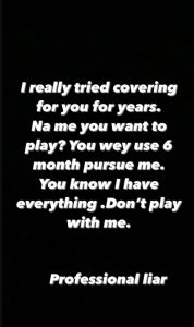 “I really tried covering for you for years. Na me you want to play? You wey use 6 months to pursue me. You know I have everything. Don’t play with me. Professional liars,” the actress wrote.