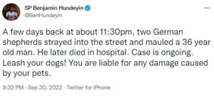 ”A few days back at about 11:30pm, two German shepherds strayed into the street and mauled a 36 year old man. He later died in hospital. Case is ongoing.