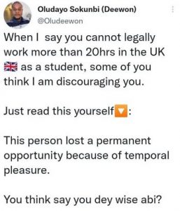The story was shared by a Twitter user identified as @Oludeewon who alleged that foreign students are not allowed legally to work more than 20 hours in UK.