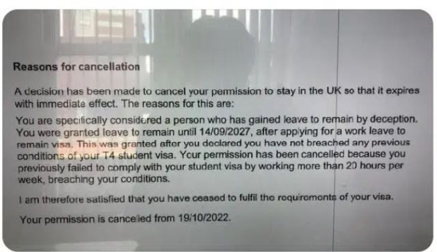 A decision has been made to cancel your permission to stay in the UK so that it expires with immediate effect. The reasons for this are: