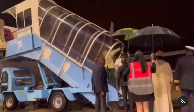 In the video shared online, President Buhari was seen getting off an airplane before entering a car, while some Nigerian officials stood.