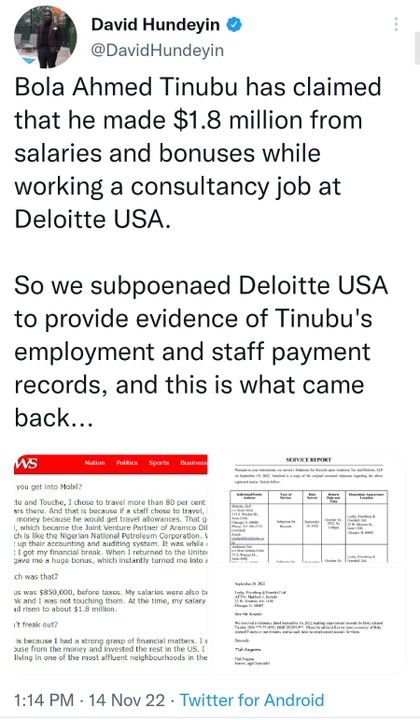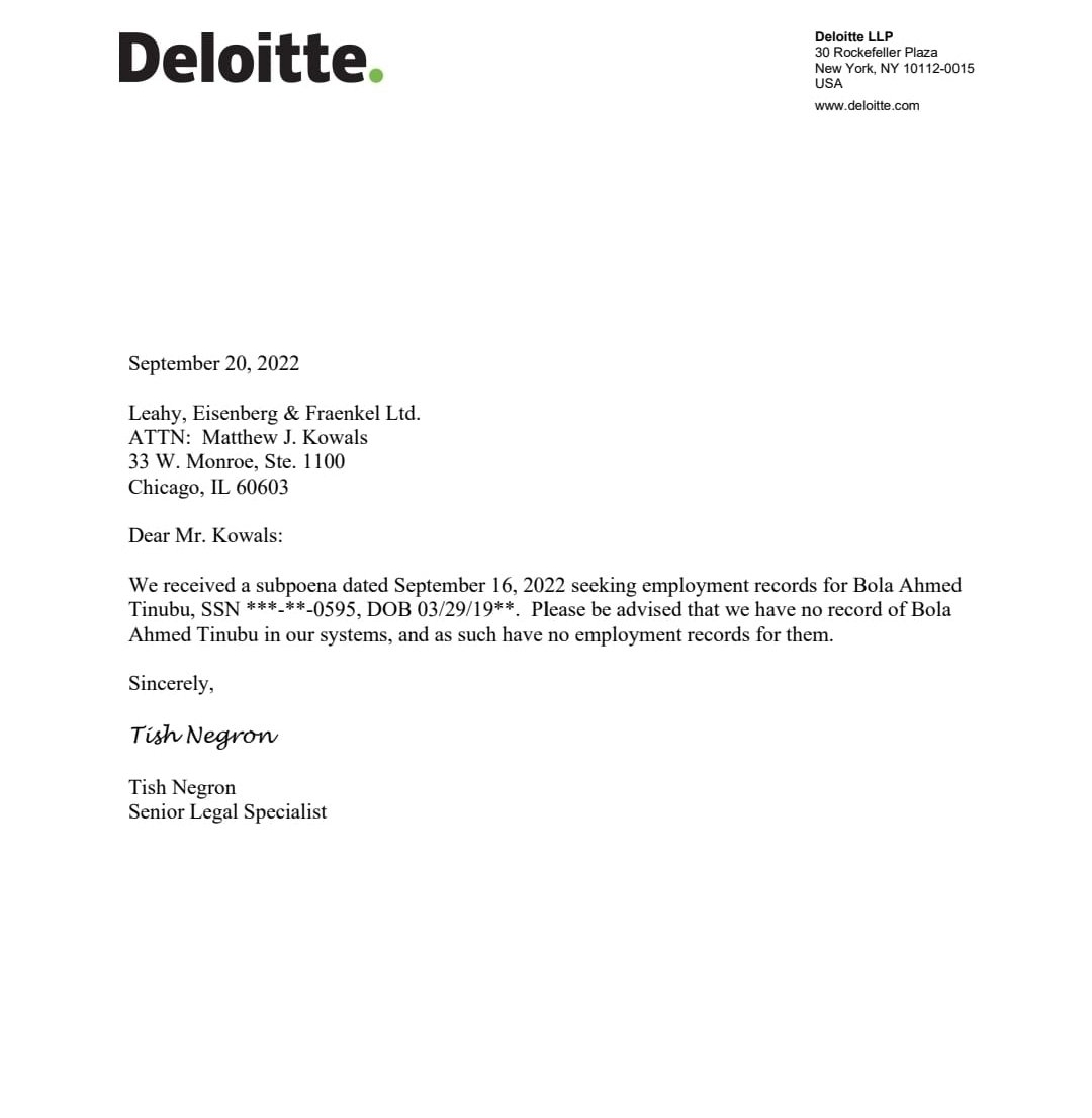 So we subpoenaed Deloitte USA to provide evidence of Tinubu’s employment and staff payment records, and this is what came back and there’s more…”
