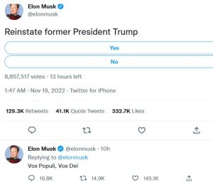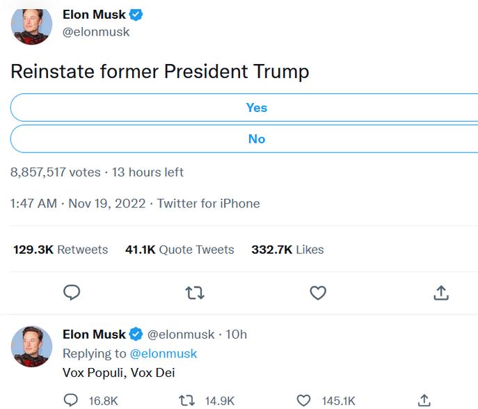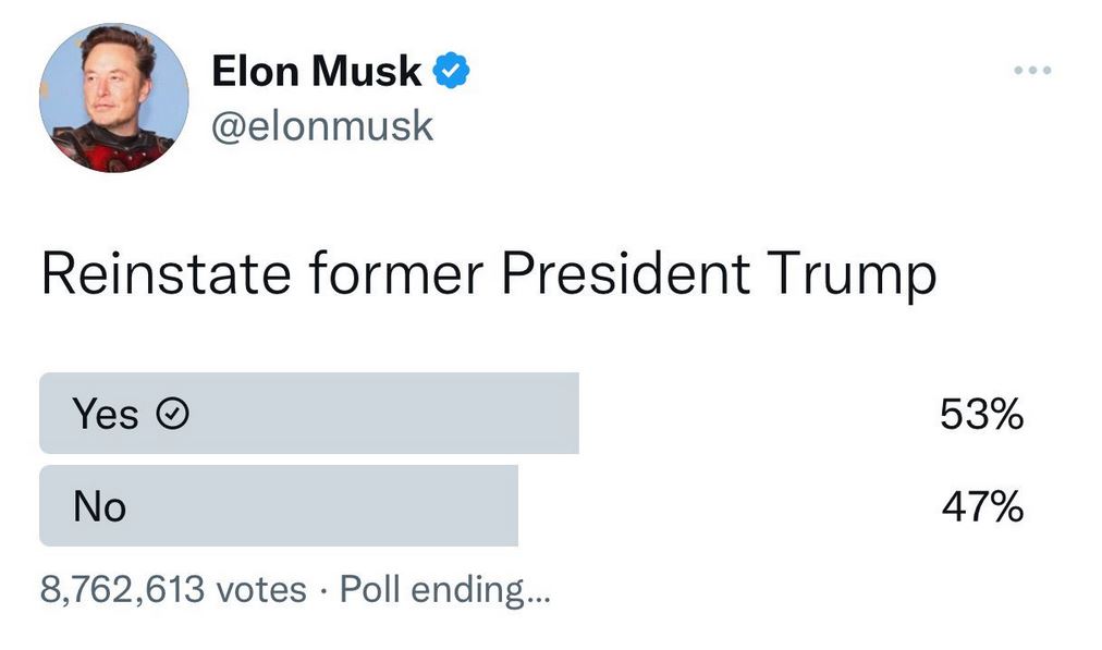 Taking to his Twitter account on Friday evening November 18, Musk set up a poll with the question; ”Reinstate former President Trump” and the options were Yes or No.