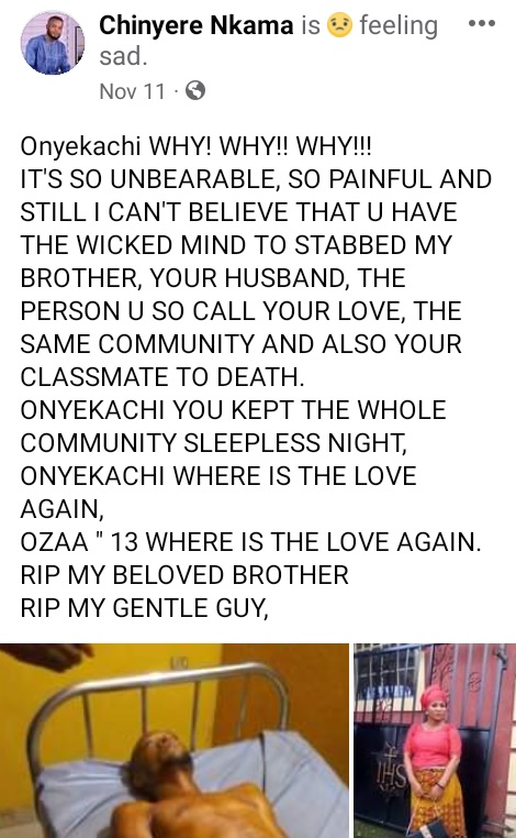 “Onyekachi WHY! WHY!! WHY!!! IT’S SO UNBEARABLE, SO PAINFUL AND STILL I CAN’T BELIEVE THAT U HAVE THE WICKED MIND TO STABBED MY BROTHER, YOUR HUSBAND, THE PERSON U SO CALL YOUR LOVE, THE SAME COMMUNITY AND ALSO YOUR CLASSMATE TO DEATH. ONYEKACHI YOU KEPT THE WHOLE COMMUNITY SLEEPLESS NIGHT. ONYEKACHI WHERE IS THE LOVE AGAIN. OZAA ” 13 WHERE IS THE LOVE AGAIN. RIP MY BELOVED BROTHER. RIP MY GENTLE GUY” he wrote.