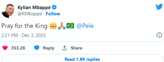 Following announcement Pele is not getting better, Kylian Mbappe took to Twitter to write: “Pray for the King.”