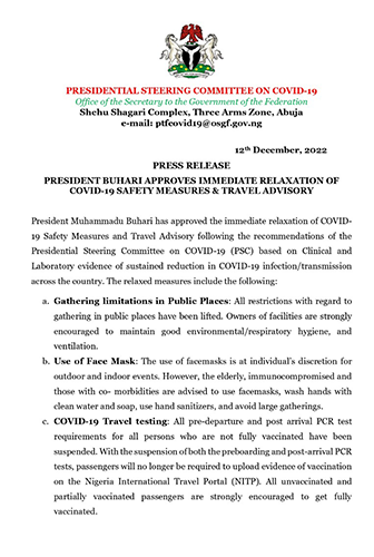 “With the suspension of both the preboarding and post-arrival PCR tests, passengers will no longer be required to upload evidence of vaccination on the Nigeria International Travel Portal (NITP). All unvaccinated and partially vaccinated passengers are strongly encouraged to get fully vaccinated.
