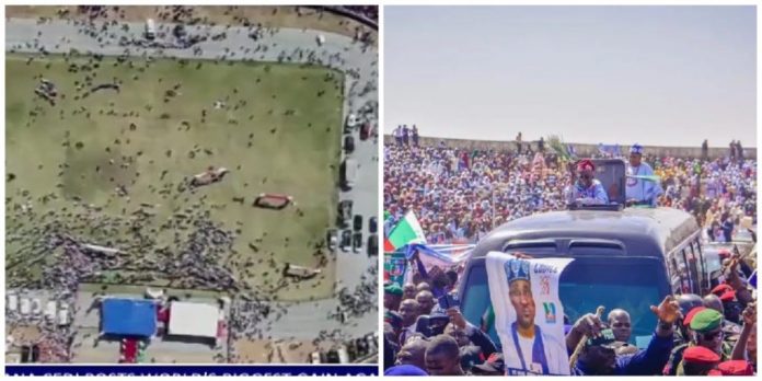 However, on Wednesday a drone coverage of Channels TV at the rally on Tuesday shows otherwise, with the drone view showing that the stadium which was used was scanty and not filled up as widely reported.