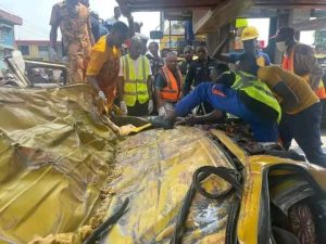 The agency confirmed further that recovery of the fallen container is still ongoing, noting that though the container has been taken off on top of the minibus, it is yet to be completely removed from the location, as the accident has caused traffic on the route while there is a backlog of traffic presently at Alaka.
