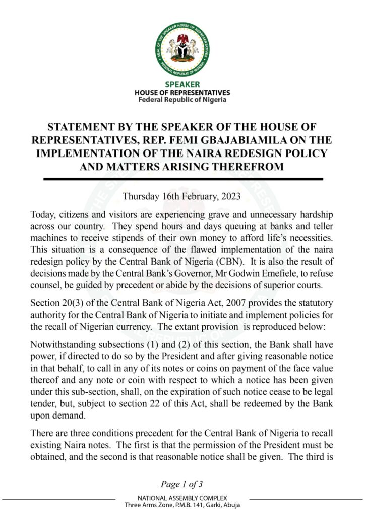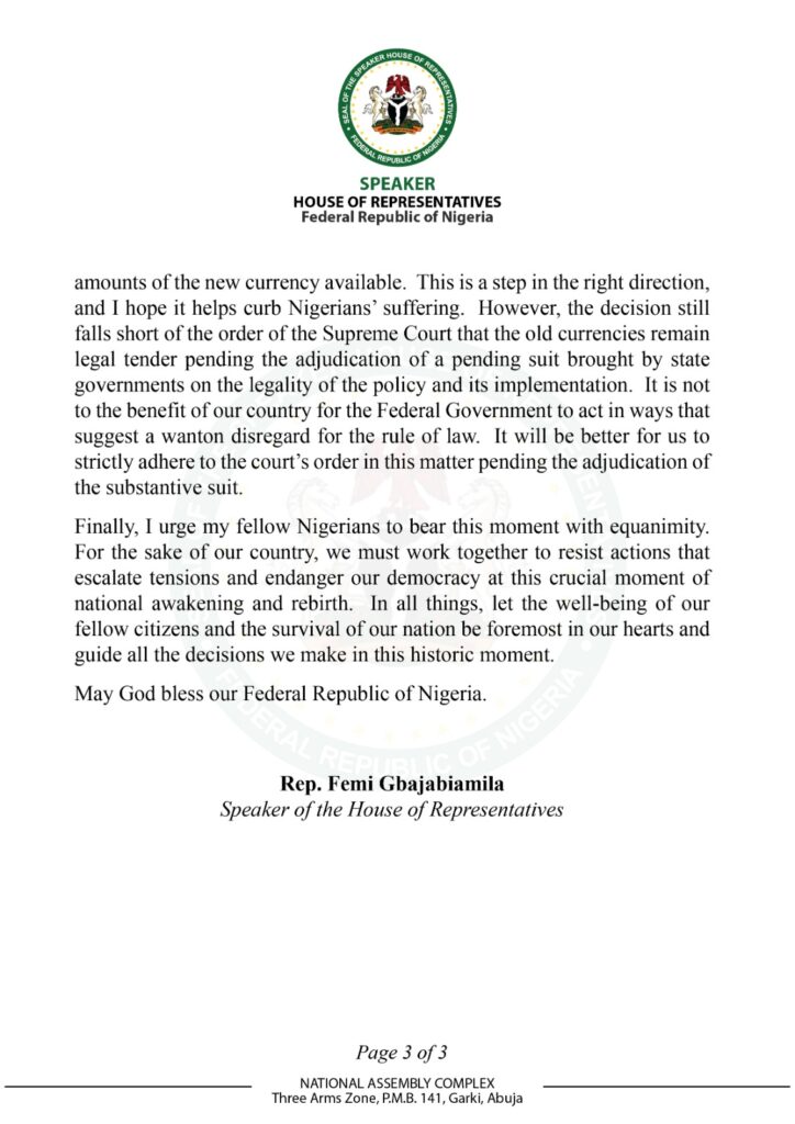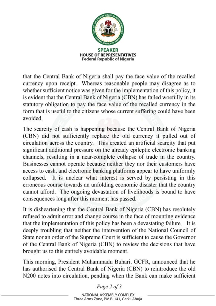 However, the Speaker said the President’s directive falls short of the Supreme Court order that the old currencies remain legal tender pending the adjudication of a pending suit brought by state governments on the legality of the policy and its implementation.