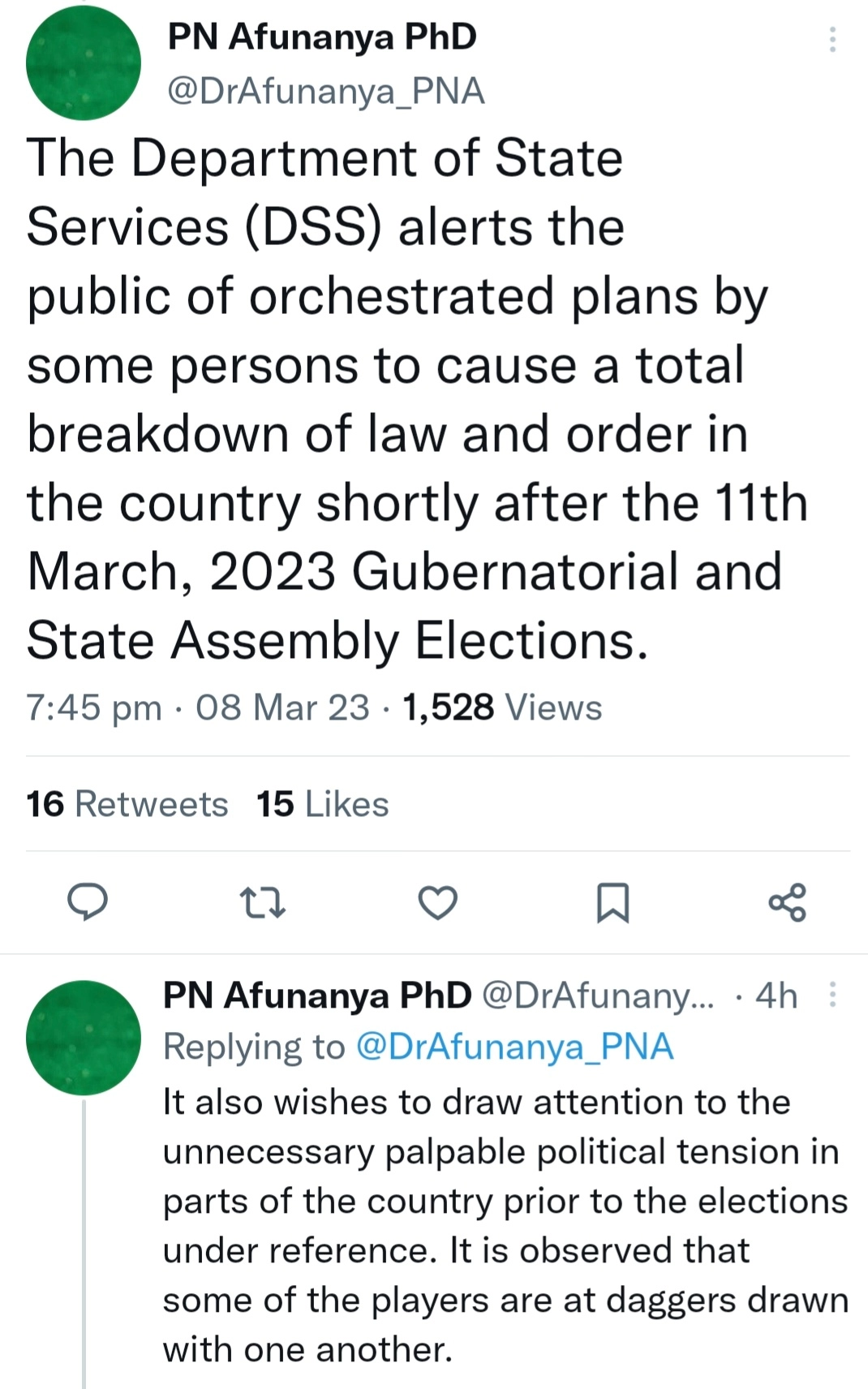 “The Department of State Services alerts the public of orchestrated plans by some persons to cause a total breakdown of law and order in the country shortly after the March 11, 2023 governorship and state assembly elections.