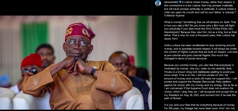 Former Presidential aide and author, Reno Omokri has taken to Instagram to lambast the President-elect, Asiwaju Bola Tinubu.