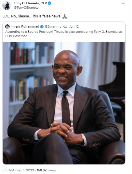 Billionaire businessman, Tony Elumelu, has denied claims that President Tinubu plans to make him the next governor of the Central Bank of Nigeria.