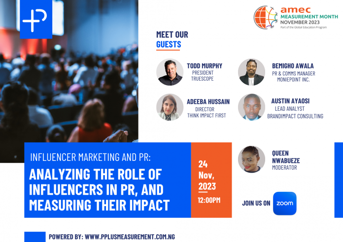Lagos, 20th November, 2023 – P+ Measurement Services, a leading media intelligence consultancy, proudly announces its seventh consecutive year hosting the prestigious AMEC Measurement Month. This year’s highly anticipated event will delve into the critical theme of “Influencer Marketing and PR: Analyzing the Role of Influencers in Modern PR and Measuring Their Impact.”