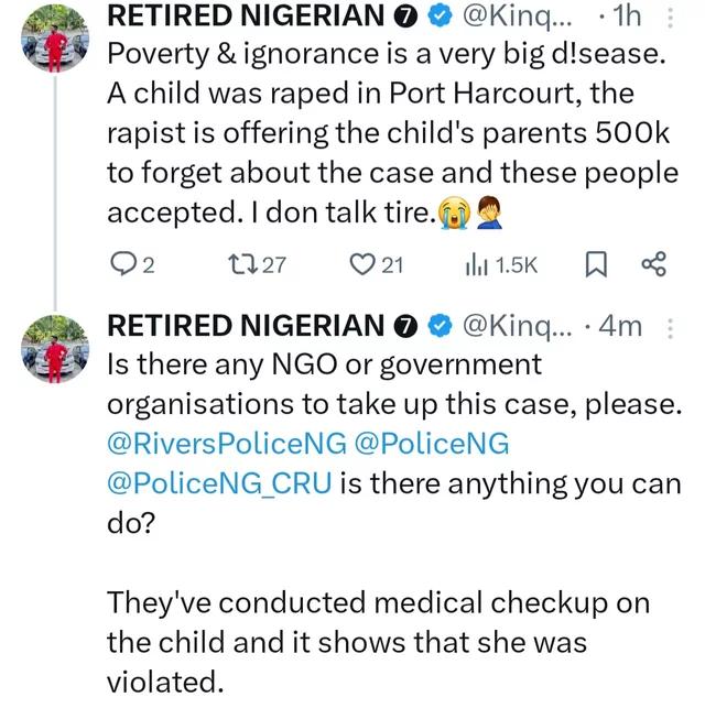 The activist wrote on X: “Poverty & ignorance is a very big d!sease. A child was r@ped in Port Harcourt, the rapist is offering the child’s parents 500k to forget about the case and these people accepted. I don talk tire.”