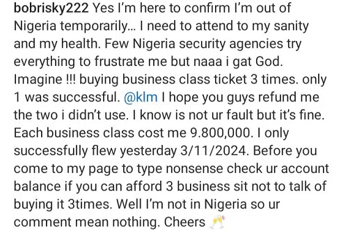 “Yes I’m here to confirm I’m out of Nigeria temporarily… I need to attend to my sanity and my health. Few Nigeria security agencies try everything to frustrate me but naaa i gat God. Imagine !!! buying business class ticket 3 times. only 1 was successful. @kIm I hope you guys refund me the two i didn’t use. I know is not ur fault but it’s fine. Each business class cost me 9.800,000. I only successfully flew yesterday 3/11/2024. Before you come to my page to type nonsense check ur account balance if you can afford 3 business sit not to talk of buying it 3times. Well I’m not in Nigeria so ur comment mean nothing. Cheers”