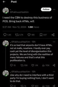 In her detailed post, she shared her dissatisfaction with the widespread use of POS services and pleaded for the return of well-functioning ATM centers nationwide.