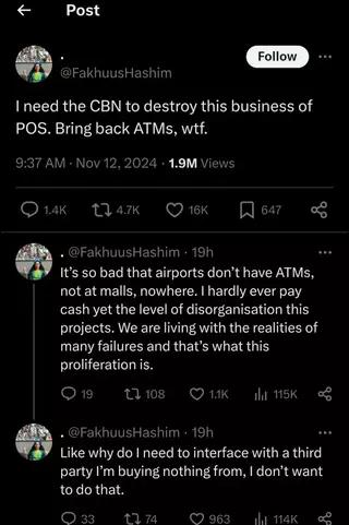 In her words: “I need the CBN to destroy this business of POS. Bring back ATMs, wtf. It’s so bad that airports don’t have ATMs, not at malls, nowhere. I hardly ever pay cash, yet the level of disorganization this projects is shocking. We’re living with the realities of many failures, and this proliferation is part of that. Why do I need to interact with a third party I’m buying nothing from? I don’t want to do that.”