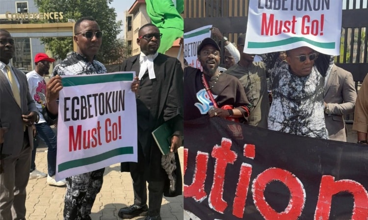 Visual evidence from the scene captured Sowore briefly participating in the protest, raising a placard reading “Egbetokun Must Go” while chanting alongside demonstrators before departing.