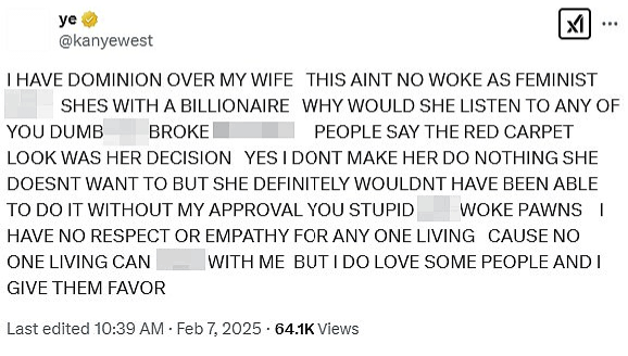 The exchange has fueled growing concerns about West’s level of control over Censori, prompting many public figures to speak out and refer to Censori as a “hostage” and a “victim” who is being coerced by Kanye to do things.