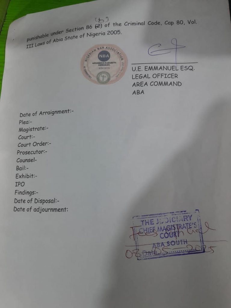 The Charge also said that the offense is punishable under Section 516 A(a) of the Criminal Code Cap 80 Laws of Abia State of Nigeria among others.