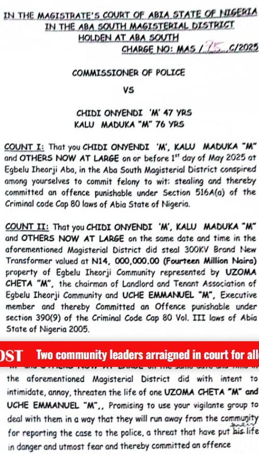 A Chief Magistrate Court sitting in Aba South LGA, has arraigned two men, Chidi Onyendi (47) and Kalu Maduka (76), on allegations of conspiracy, theft of a N14 million transformer, and issuing threats against community leaders who reported them.