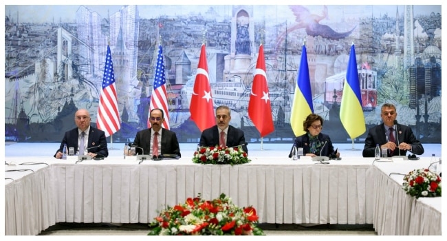 Fidan sat at the head of a table, with Turkish, Russian, and Ukrainian flags in the background. The two delegations were seated across from each other in the meeting room, while hundreds of journalists gathered outside.