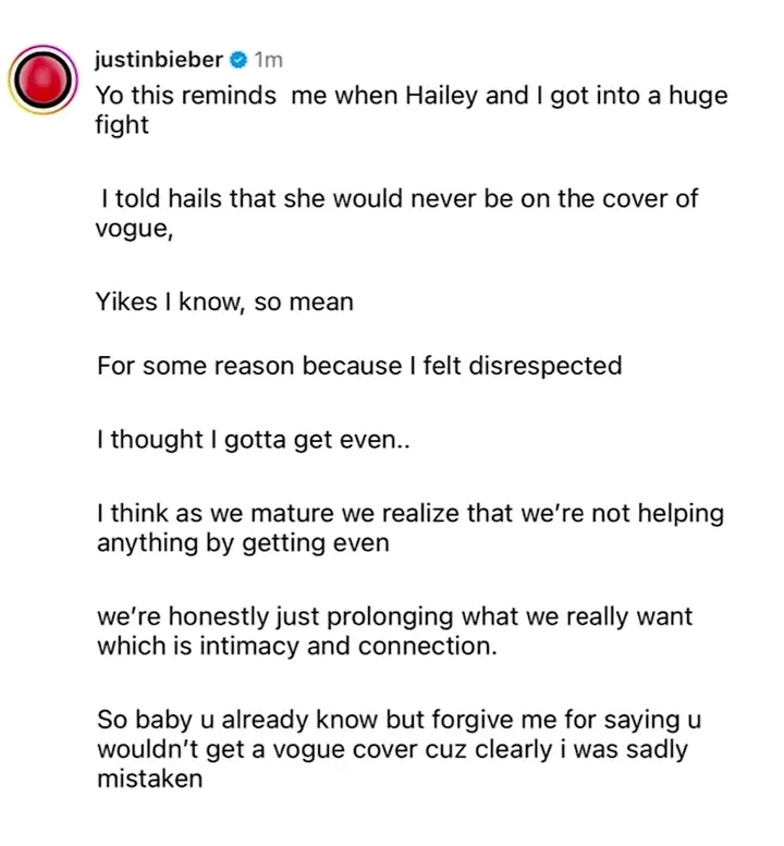 In a recent Instagram post, Justin Bieber revealed he uttered hurtful words to Hailey, because he felt disrespected.