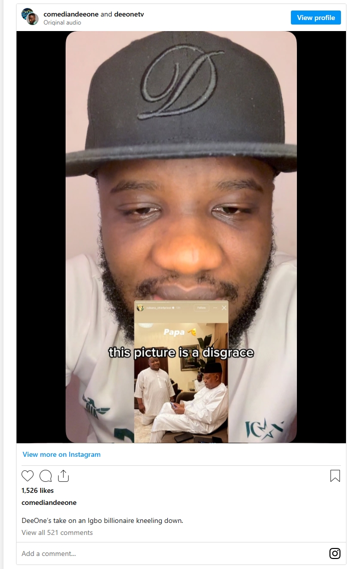 Comedian Deeone has reacted to a photo of businessman Cubana Chief Priest kneeling for the Vice President of Nigeria