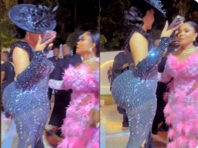 The mystery lady with a heavy backside was accosted by Nollywood actress, Iyabo Ojo at the grand finale of the wedding ceremony, held in Tanzania.