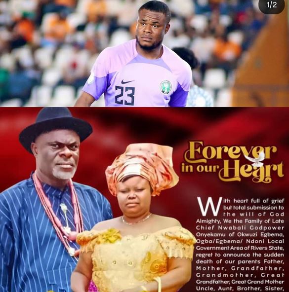Stanley Nwabali, the Super Eagles goalkeeper has announced the burial arrangements for his late parents, Chief Nwabali Godspower Onyekamu and Mrs. Grace Nwabali (née Mmai), describing the period as one of profound and unimaginable grief.