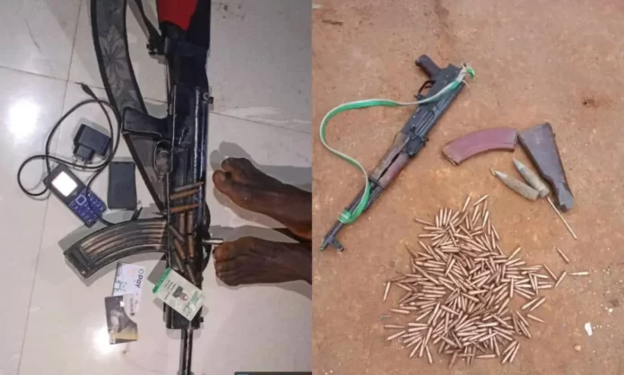 Items recovered from the suspect include an AK-47 rifle, a magazine, three rounds of 7.62mm special ammunition, seven empty shells, a fake vigilante ID card, a mobile phone, and two ATM cards.
