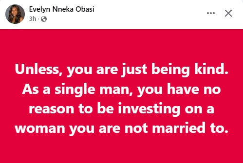 “Unless, you are just being kind. As a single man, you have no reason to be investing on a woman you are not married to,” she wrote on Friday.