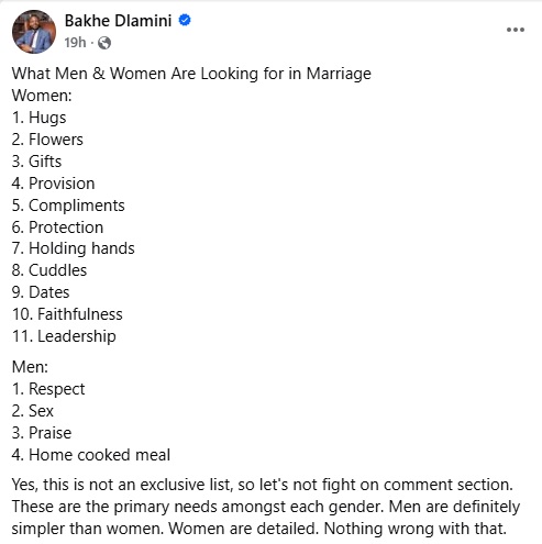 Dlamini took to Facebook to share his list. He mentioned that men need respect, s3x, praise and home cooked meals.