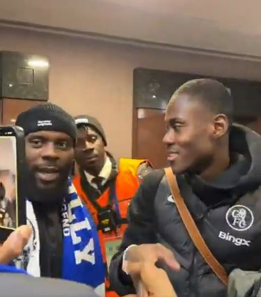 Nigerian afrobeats artist Odumodublvck was spotted at Stamford Bridge celebrating Chelsea’s 3–0 win over Barcelona, sharing a moment with the club’s defender, Trevoh Chalobah.