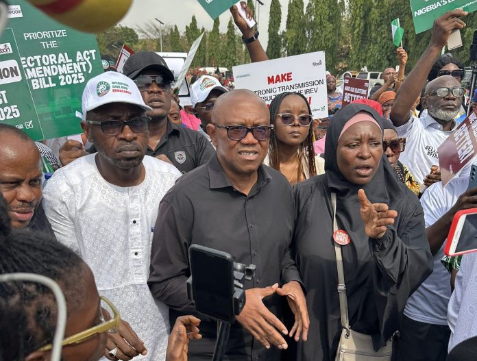 Former presidential candidate and prominent figure ahead of the 2027 general elections, Peter Obi, on Monday led a group of protesters to the National Assembly in Abuja to demand electoral reforms, with a strong focus on electronic transmission of election results.