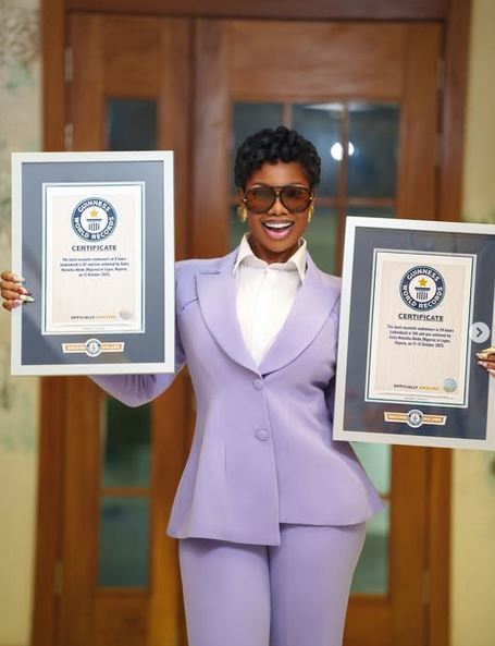 Former Big Brother Naija housemate Tacha Akide has shared photos of her Guinness World Record plaque, celebrating her accomplishment of completing 82 makeovers in 8 hours and 143 makeovers in 24 hours, surpassing the previous record of 64 makeovers in 8 hours.