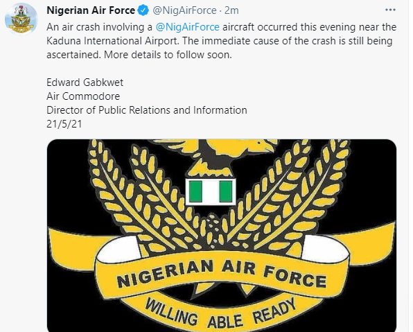 A tweet by the Nigerian Air Force confirmed that air crash, involving a @NigAirForce aircraft, occurred near the Kaduna International Airport.