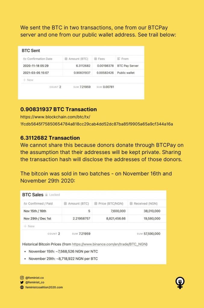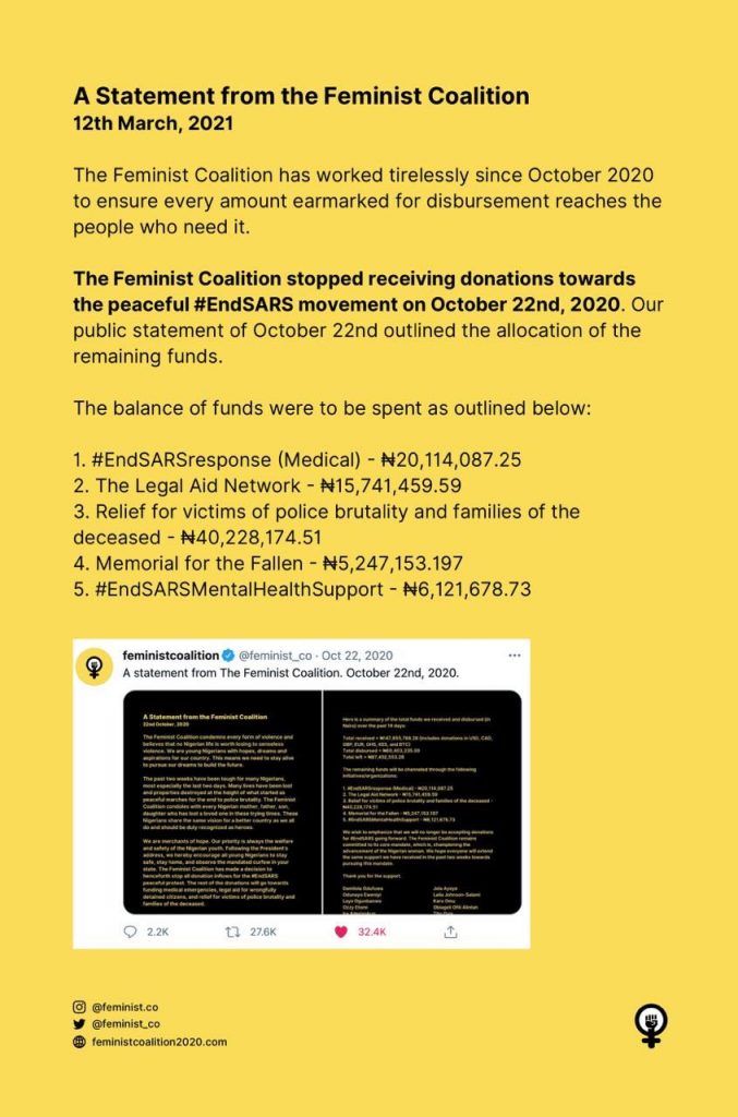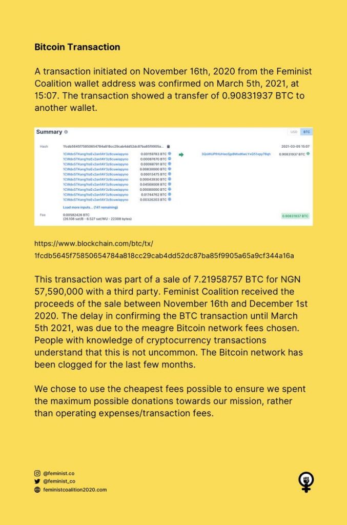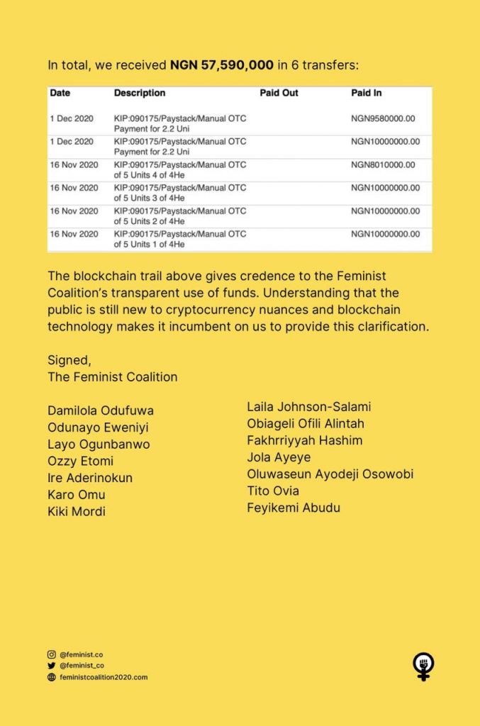 The Feminist Coalition has reacted to the allegation of withdrawing N23m worth of bitcoin donated for the #EndSARS protest and transferring it to another account.