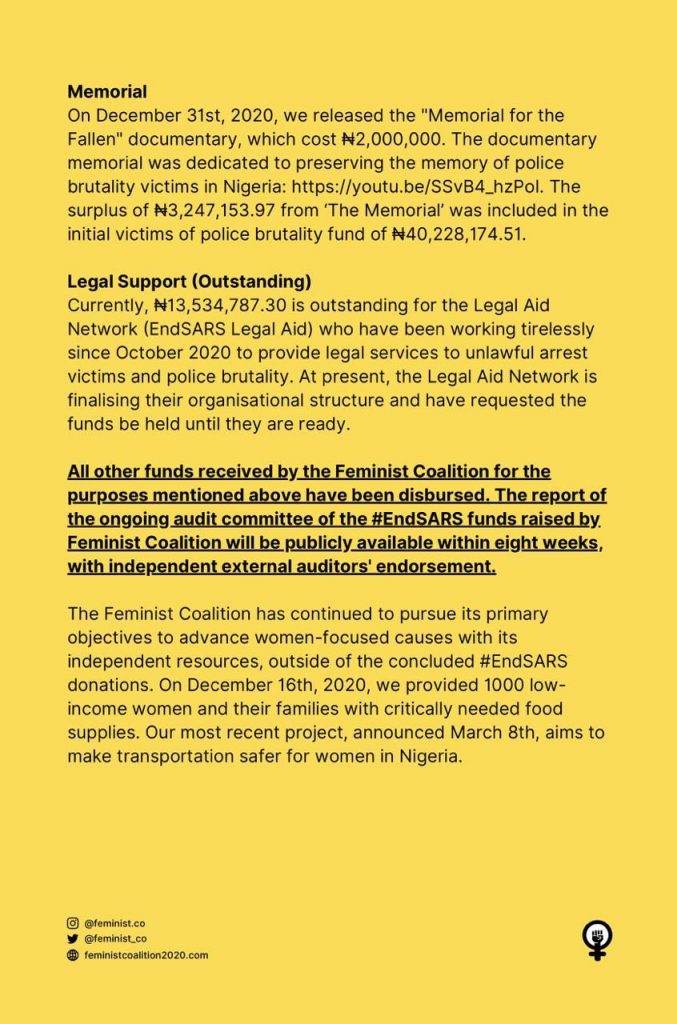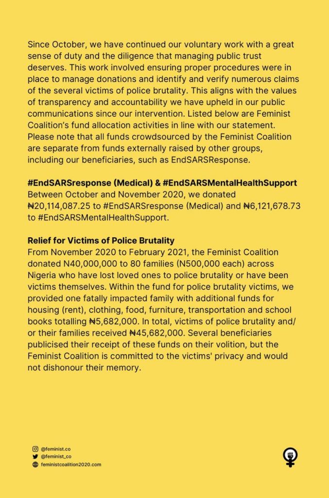 The Coalition also gave a breakdown of its expenses from the donation made during the #EndSARS protest.