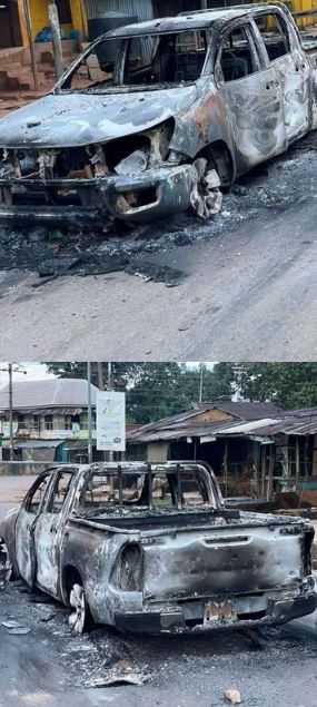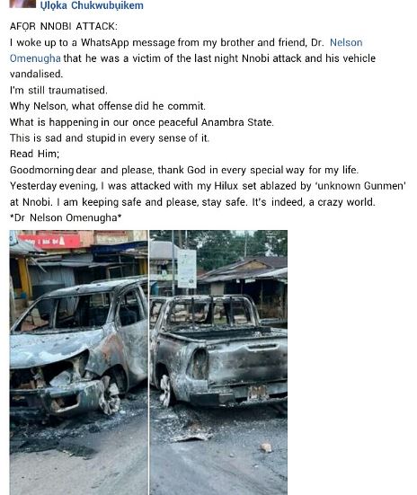 One of the vehicles burnt by the hoodlums belonged to Dr Nelson Omenugha, the son of Anambra Commissioner for Basic Education, Prof Kate Omenugha.