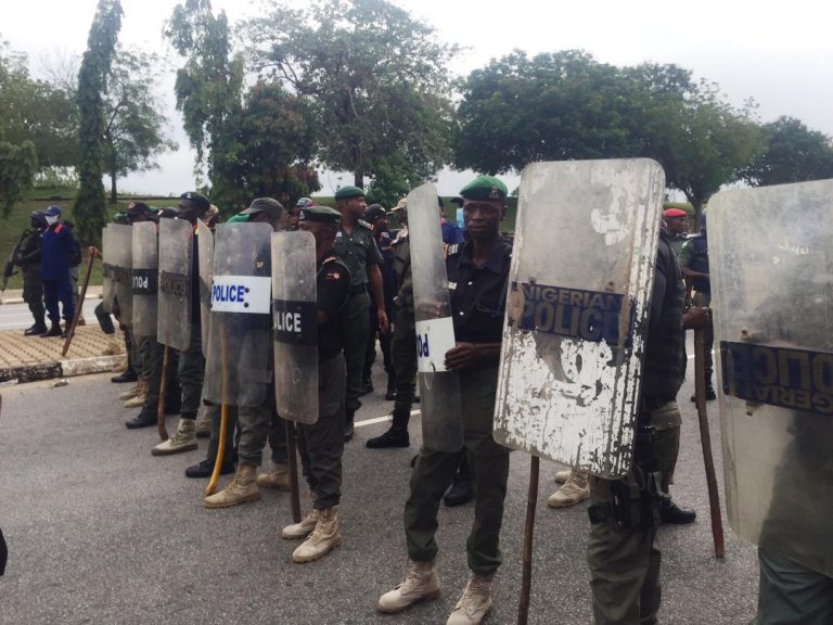 Heavily armed security operatives have blocked protesters marking the #EndSARSMemorial from marching to the National Assembly.