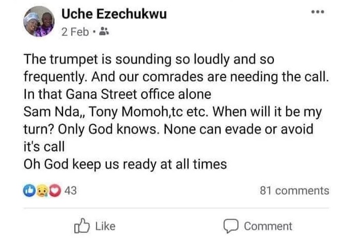 Ezechukwu died just over three weeks after a cryptic post on Facebook.